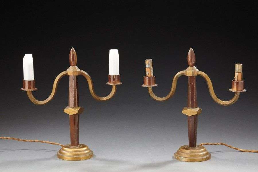 Paire de candélabres à fût quadrangulaire bagué surmonté de deux bras de lumière formant volutes en métal à patine brune et dorée. Ils reposent sur une base circulaire à gradins. Un est signé "Pomone". Vers 1940. H: 26,5 cm L: 24 cm (manques et accidents aux fleambeaux)