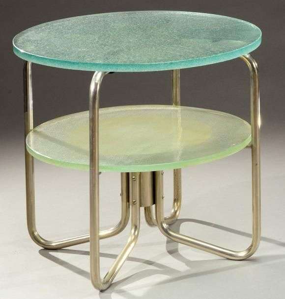 Table basse présentant deux plateaux circulaires en épaisse dalle de verre reposant sur un piétement cylindrique courbé en métal chromé. H: 56 cm Diam: 60 cm (plateaux à teinte différente et légers éclats)