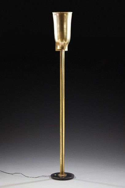Lampadaire en bronze doré présentant un fût cylindrique surmonté d'une vasque évasée et agrémentée d'éléments en ailette profilées. Il repose sur une base circulaire plaquée de métal laqué noir. H: 184 cm