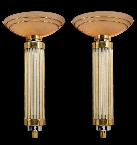 Importante paire d'appliques à armature cylindrique à gradin en laiton doré et métal chromé enserrant des tubes alternés en verre translucide et satiné surmonté d'un large réflecteur de forme demihémisphérique en verre sablé teinté rose. H: 96 cm L: 53 cm P: 26 cm (légers accidents)