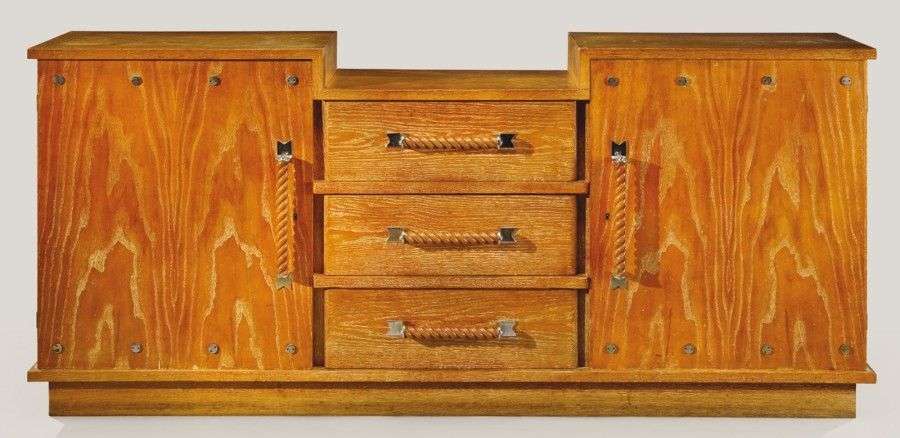 Enfilade à caisson cubique tripartite en placage de chêne ouvrant au centre par trois tiroirs superposés fleanqués de deux portes latérales à poignées torsadées maintenues par des attaches en métal chromé. H: 90 cm L: 200 cm P: 48 cm (manques de placage et usures)