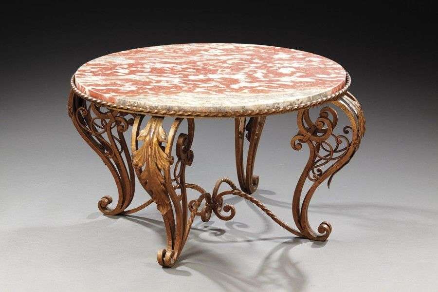 Table basse en fer forgé à patine doré à plateau circulaire en marbre rouge veiné blanc reposant sur quatre montants galbés ajourés à motifs feuillagés reliés par une entretoise en "X". Vers 1950. H: 43 cm Diam: 77 cm
