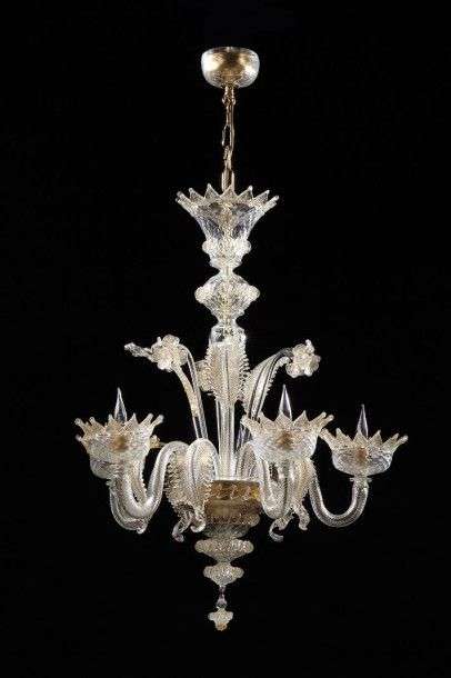 Lustre en verre soufflé translucide à inclusions de paillettes d'or composé de cinq bras de lumière et agrémentés d'éléments décoratifs feuillagés et fleoraux. H: 100 cm Diam: 58 cm