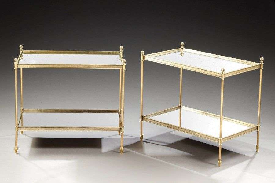 Paire de bouts de canapé présentant deux plateaux rectangulaires superposés en miroir enserrés dans une structure en bronze doré.