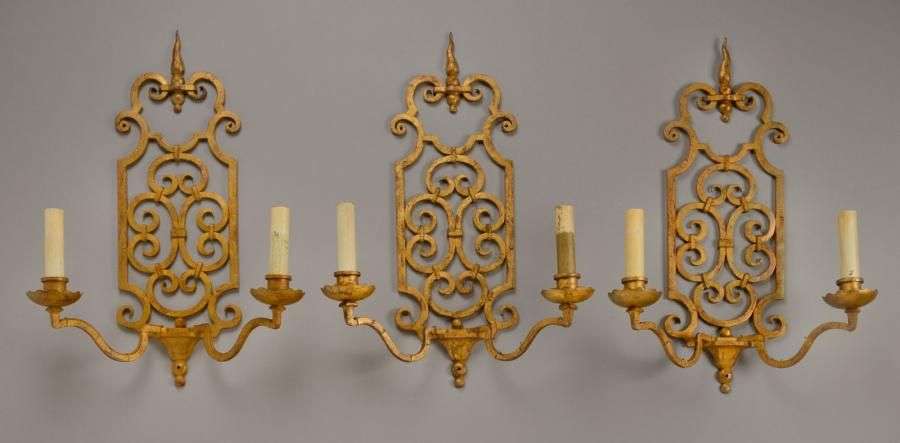 Suite de trois appliques en fer forgé à deux bras de lumière à patine mordorée présentant une platine de fixation ajourée à décor d'enroulements. Vers 1959. H: 63 cm L:45 cm P: 19 cm