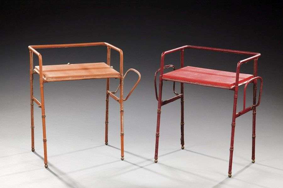 Suite de deux tables de chevet à armature en métal entièrement gainée de cuir rouge et marron. Vers 1950. H: 57 cm l: 47 cm P: 30 cm (usures et manques)
