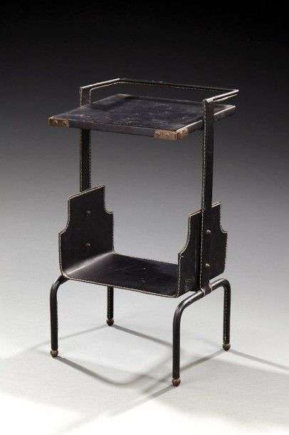 Table de fumeur à deux plateaux rectangulaires superposés entièrement gainé d'un cuir noir piqué-sellier et reposant sur une structure tubulaire. Vers 1950. H: 55 cm L: 30 cm P: 27 cm