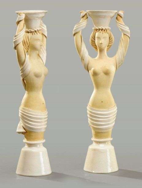 Rare paire de bougeoirs anthropomorphes en faïence émaillée blanche crème figurant deux femmes à demi-nue et reposant sur une base circulaire. Vers 1940-1950. H: 32 cm