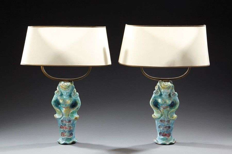 Paire d'appliques murales en céramique émaillée polychrome figurant une sirène surmontée d'un arc en laiton à deux bras de lumière agrémentés d'abats-jour en rhodoïd. H: 48,5 cm L: 37 cm P: 14 cm