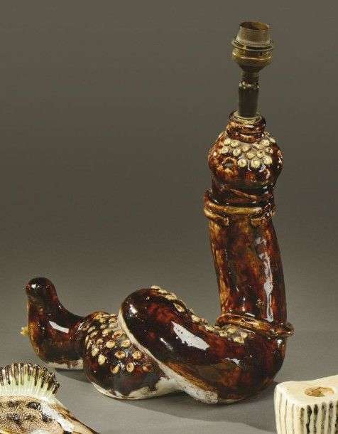 Lampe zoomorphe en céramique émaillée brune nuancée blanche figurant un serpent. Vers 1950. H: 21 cm L:21 cm P: 12 cm