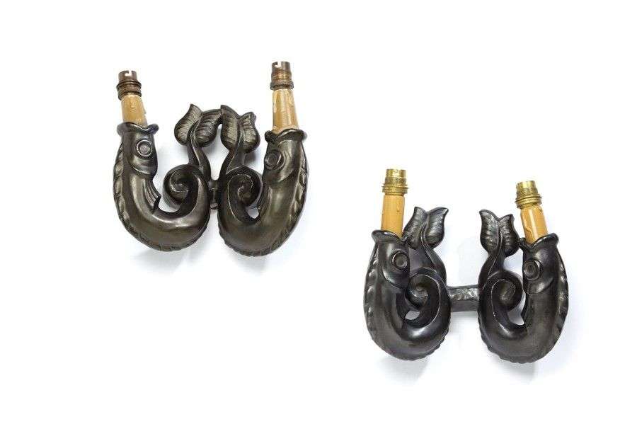 Paire d'appliques en céramique émaillée noir mat à deux bras de lumière figurant des poissons. Signées "Bonfil" et "Robert Bonfil création". Vers 1960. H: 22 cm L: 24 cm P: 8 cm
