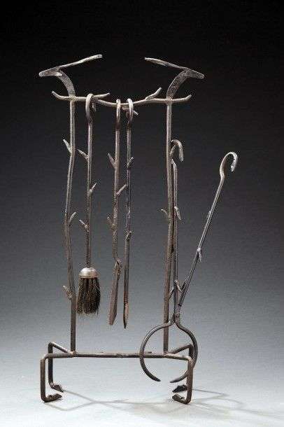 Nécessaire de cheminée en métal à décor d'antilopes comprenant quatre ustensils. H: 84 cm l: 40 cm P: 15 cm