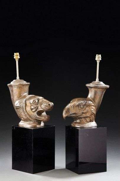 Suite de deux lampes en laiton argenté figurant une tête d'aigle et une panthère. Elles reposent sur une base cubique en résine noire. H: 48 cm (usures)