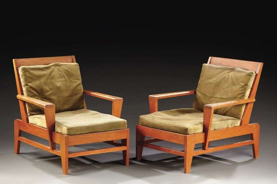 Importante paire de fauteuils en hêtre teinté à piétement profilé. Garniture de l'assise et du dossier recouverte d'un velour vert. Vers 1950-1960. H: 81 cm l: 73 cm P: 88 cm (taches et légères usures)