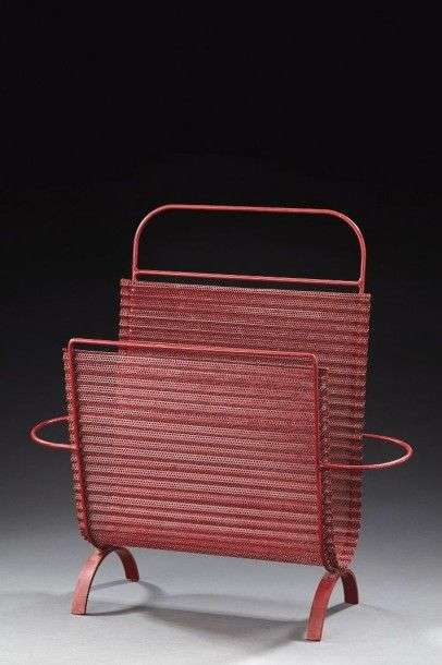 Porte-document en rigitule courbé ajouré et laqué rouge reposant sur deux pieds arqués. Vers 1950. H: 44,5 cm L: 44 cm P: 15,5 cm