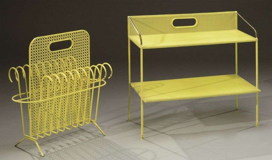 Etagère d'appoint à deux plateaux recatngulaires superposés en métal perforé laqué jaune reposant sur quatre pieds quadranguliares terminés par des patins évasés. On y joint un porte-documents en métal tubulaire et tôle perforée laquée jaune. Vers 1950. Etagère: H: 55 cm L: 60 cm p: 35 cm Porte document: H: 52 cm L: 50.5 cm P: 33 cm (rayures d'usage)