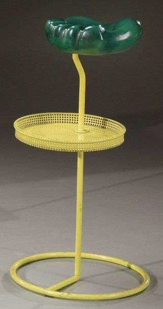 Petite table de fumeur modèle "support cendrier n°3" à fût en métal tubulaire laqué jaune, enserrant une tablette en tôle perforée, terminé par un piétement en enroulement et surmonté d'une patte d'ours en céramique émaillée verte. Signée sous la céramique du sigle de l'Alpha. Vers 1950. H: 60 cm L: 30 cm (rayures d'usage au pied)