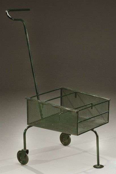 Bar modèle "pousse-pousse" à structure en métal tubulaire et à caisson cubique compartimenté perforé laqué vert. Modèle créé en 1952. H: 79 cm L: 40 cm P: 50 cm