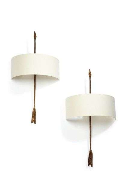 Paire d'appliques modèle «fleèches» en bronze à patine mordorée présentant des abat-jour en demi-lune de couleur crème. Vers 1960. H: 70 cm L: 36 cm P: 18 cm