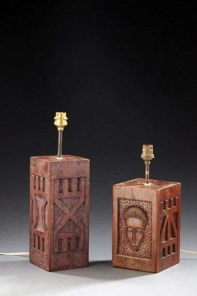 Suite de deux lampes en chêne sculpté à décor de visages africanistes et de motifs géométriques en creux. H: 25,5 cm (la grande)
