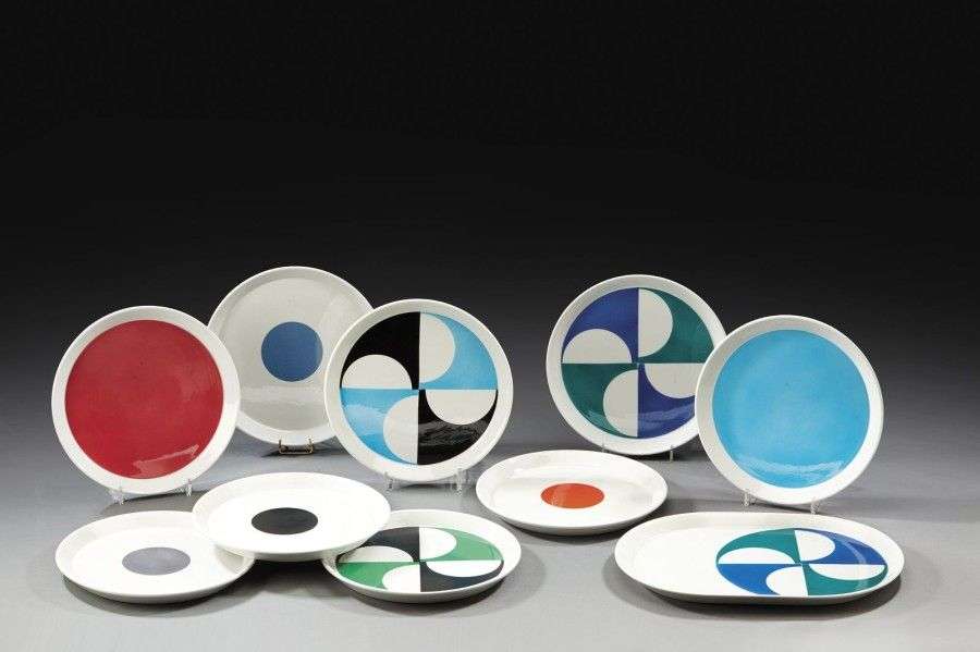Suite de dix assiettes dont un plat ovale en céramique émaillée blanche à décor de motifs géométriques polychromes. Signées "Gio Ponti" et du tampon "Ceramica Franco POzzi". Vers 1960. Diam: 26 cm