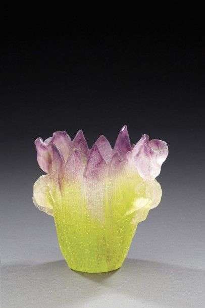 Vase en verre polychrome à décor de fleurs dans les tons vert et mauve. Signée "Daum France". Vers 1970. H: 13 cm