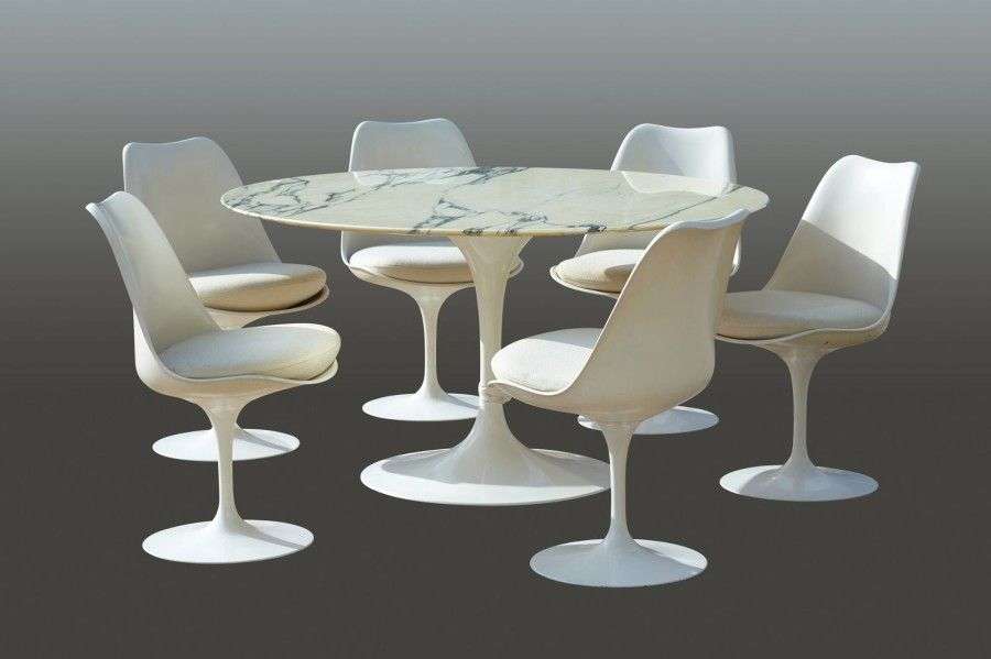 Table de salle à manger à plateau circulaire en marbre blanc veiné gris reposant sur un piétement tulipe en métal laqué blanc. On y joint six chaises au modèle à assise en coque moulée reposant sur un piétement tulipe en métal laqué blanc. Garniture de l'assise recouverte d'un tissu beige. Vers 1980. H: 72 cm Diam: 135 cm Chaises: H: 80 cm l: 49 cm P: 48 cm