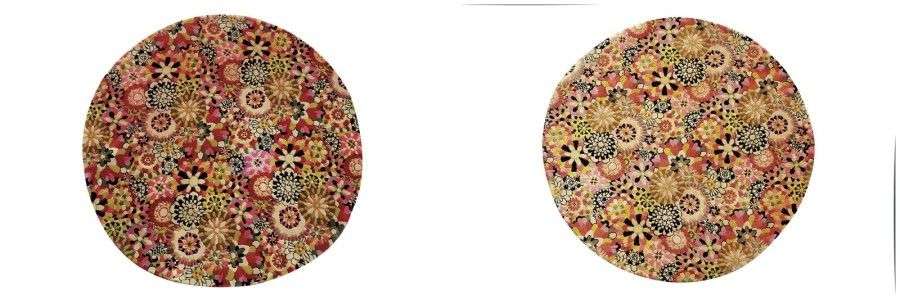Paire de tapis circulaires à tissage mécanique en haute laine polychrome à motifs fleoraux rayonnants. Bolduc en cuir d'origine. Diam: 202 cm