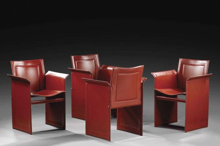Suite de quatre fauteuils visiteur à structure en métal entièrement recouverte d'un cuir marron piqué-sellier. Vers 1990-2000. H: 84 cm l: 60 cm P: 50 cm (usures) 385