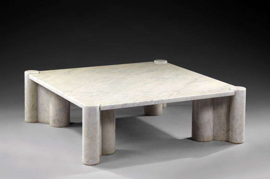 Table basse modèle "Jumbo" en marbre blanc veiné gris. Modèle créé vers 1964. H: 36 cm Plateau: 113 x 113 cm (légères usures et petits éclats en bordure)