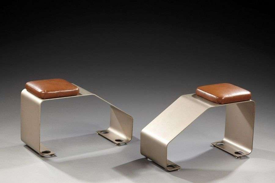 Paire de repose-pieds en lames plates d'aluminium à assise carrée en cuir marron. H: 38 cm l: 61 cm P: 25 cm (rayures d'usage)