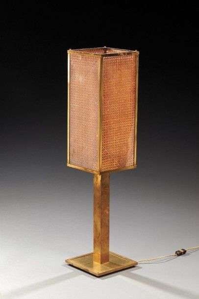 Lampe de parquet en bronze et laiton doré à fût et abat-jour quadrangulaire composé d'un cannage sous plexiglass translucide. Elle repose sur une base carrée. Vers 1960. H: 114 cm