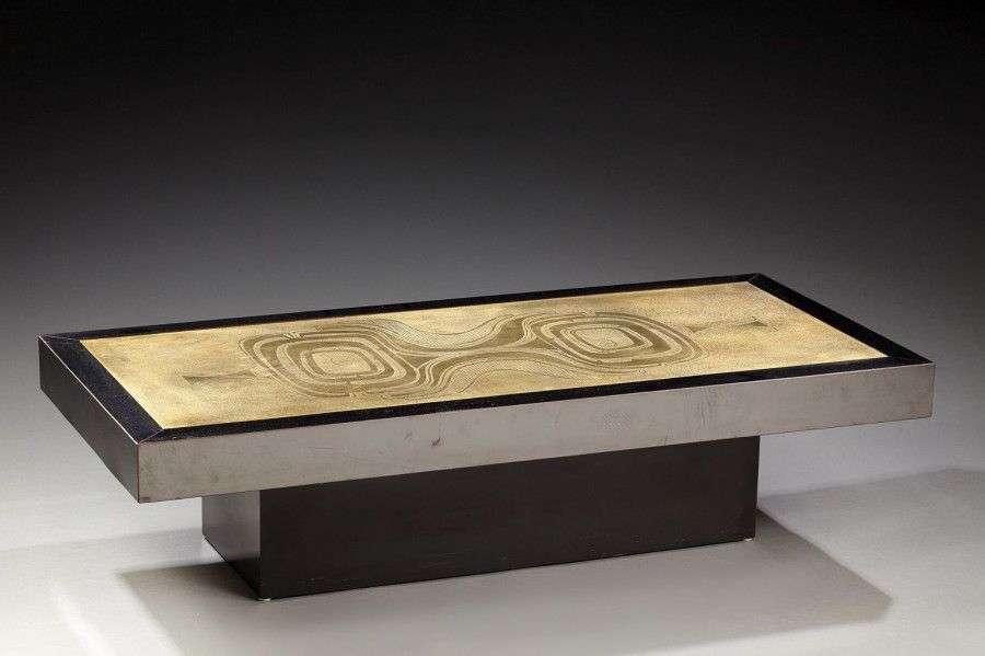 Table basse en mélaminé noir à plateau rectangulaire recouvert d'une lame en laiton à décor abstrait oxydé. H: 30 cm L: 130 cm P: 60 cm (légers éclats)
