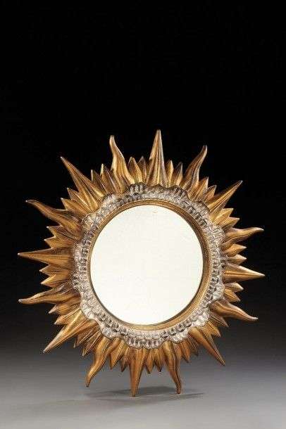 Important miroir circulaire à encadrement en bois sculpté doré et argenté figurant un soleil. Diam: 100 cm
