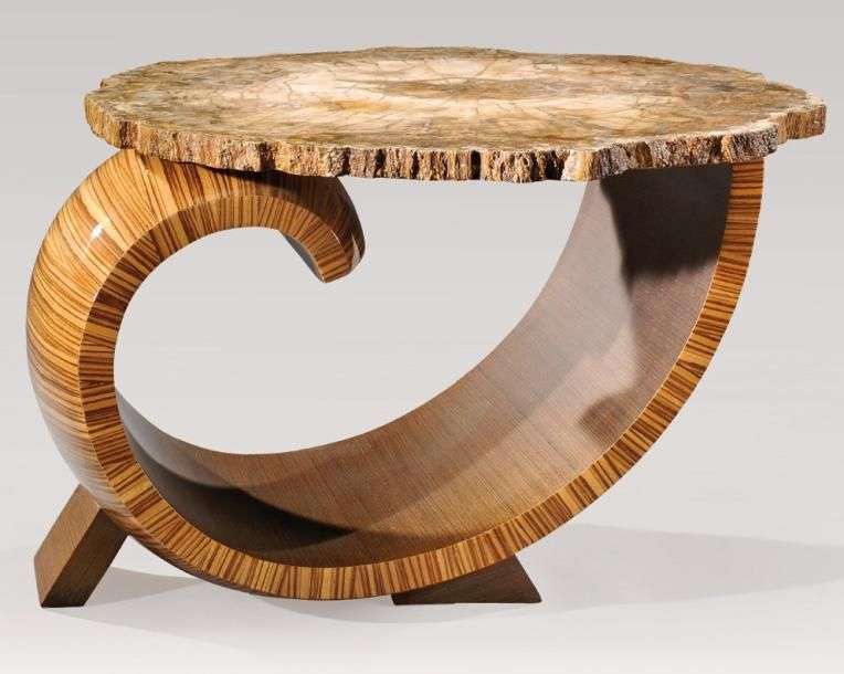Table basse à plateau en pierre fossilisée d?Araucaria d?Arizona reposant sur un piétement galbé de forme libre en placage de Zebrano et de Wengué à vernis mat et brillant.Pièce unique, signée et datée «Julien Martino- 2007». H: 46 cm - Diam: 70 cm