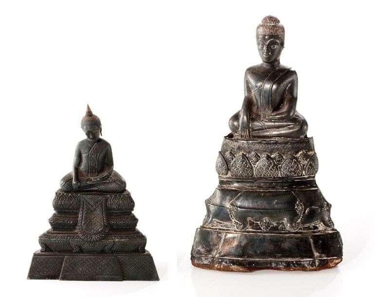 Deux figurines représentant des Bouddhas en position du lotus sur des socles en argent repoussé sur âme de terre cuite.19ème siècle Haut.: 23 cm t 28.5 cm quelques accidents