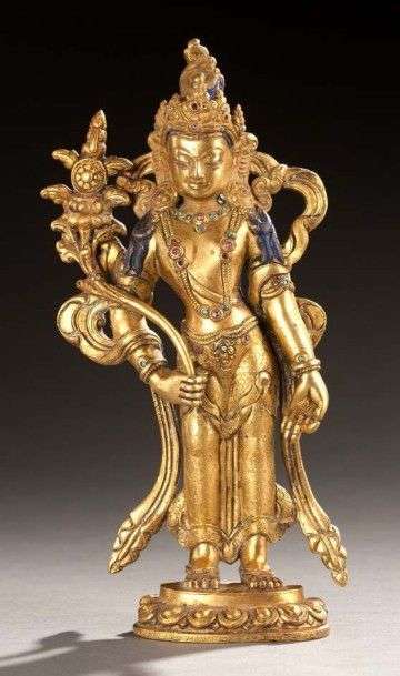 Divinité bouddhique en bronze ciselé et doré, le buste à pendeloques incrustée de verroteries. Fin du 19ème siècle Haut.: 24 cm