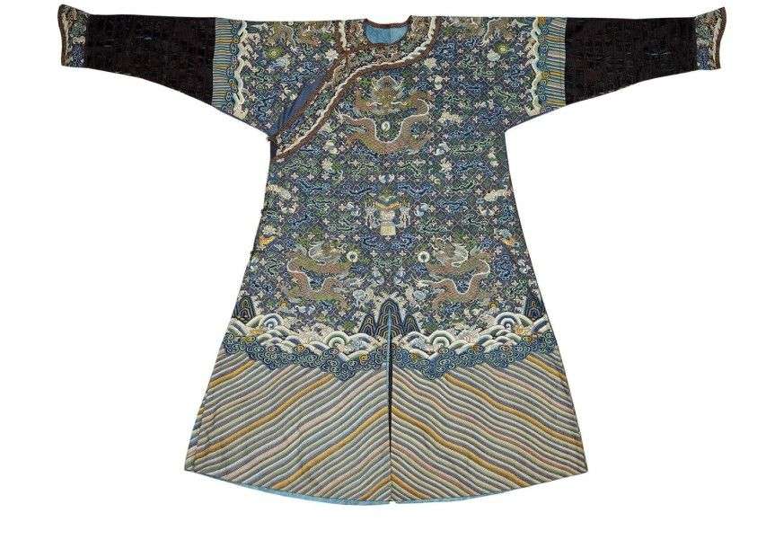 Belle et rare robe de cour probablement impériale en soie tissé kési à fond bleu à motifs de treize dragons pentadactyles en fils d'or et d'argent à la recherche de la perle sacrée sur fond de nauges, de fleurs de lotus, de svatiska et de motifs bouddhiques. dans la partie basse, pics sacrés et vaguelettes. Les boutons en bronze doré à motifs de chimères. Deuxième moitié du 19ème siècle. Haut.: 143 cm quelques usures dans la soie noire des manches Provenance: Rapporté en France en 1905 par le lieutenant de Vaisseau