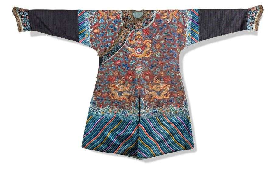 Robe en soie marron brodée de fils d'or et polychrome de huit dragons à cinq griffes encadrés de nuages et objets auspicieux avec chauve-souris.La base à motifs de pics sacrés, de vaguelettes et de lingzi. Doublée à l'intérieur d'une soie bleue. Les manches en soie noire. Deuxième moitié du 19ème siècle Haut.: 129 cm quelques fils en l'air