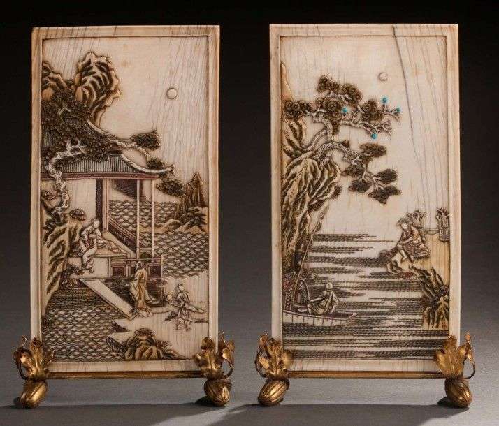 Paire de plaquettes en ivoire de forme rectangulaire formant écran de lettré sculptées sur un face en léger relief de scènes animées de personngaes (arrivée d'un messager dans un pavillon, sur l'autre homme assis s'addressant à un pécheur près d'un rocher avec pin parassol incrusté de petites turquoises). Les revers portant des inscriptions poétiques sur une feuille et dans un carré avec vase d'autel décoré de motifs d'hirondelles et Shoualo assis dans une pêche de longévité. 18-19ème siècle Elles sont adaptées sur des socles français en laiton doré à motifs de fruits d'époque art déco. Dim.: 19.5 x 10.5 cm une fente à l'un et gerces d'usage