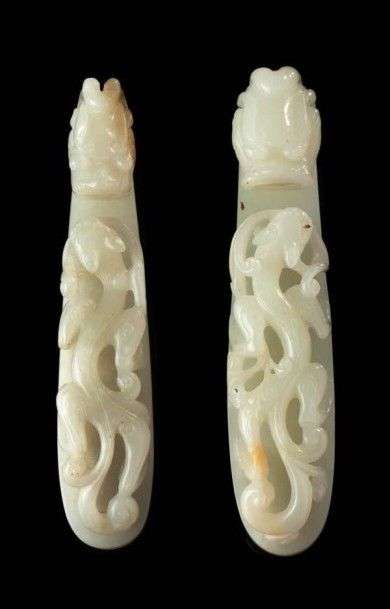 Très belle et grande fibulle en jade clair avec légères traces de rouille à la tête, sculptée d'un daïku face à une chimère. 18-19ème siècle Long.: 12.5 cm