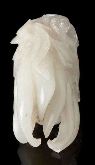 Belle et grande fibule en jade clair avec légères traces de rouille aux pieds de la chimère, sculptée d'un daïku face à une chimère. 18-19ème siècle Long.: 13 cm