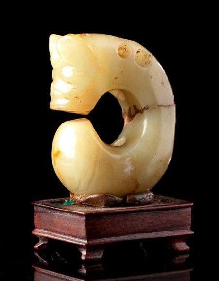 Chimère en jade vert-jaune avec traces de rouille, sculptée en arrondi. 18-19ème siècle Haut.: 5.5 cm cassée en deux
