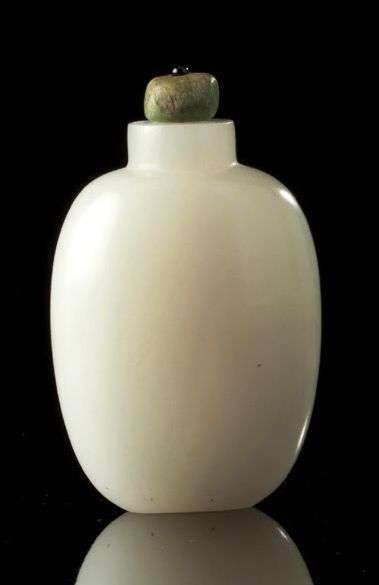 Flacon tabatière à priser en jade clair sculpté plat. Le bouchon en ivoire teinté vert. 19ème siècle Haut.: 6 cm