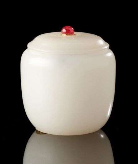 Boîte couverte circulaire en jade clair, le bouton en verre à l'imitation du corail. Au revers, marque gravée à deux caractères. 19ème siècle Haut.: 4 cm