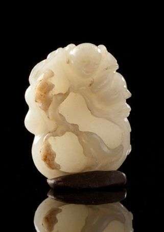 Petit groupe en jade clair sculpté représentant un enfant accroché à une pêche de longévité avec branches et feuillages. Deuxième moitié du 19ème siècle Haut.: 4.5 cm usures à deux feuilles.