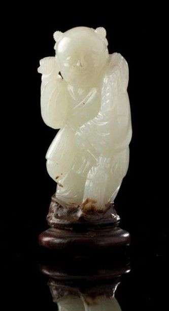 Figurine en jade clair sculpté représentant un enfant tenant une gerbe de céréales. 19ème siècle Haut.: 7 cm