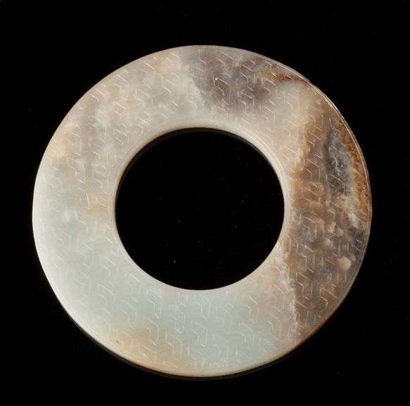 Disque bi en jade clair avec traces de rouille, ciselé de motifs géométriques. 19ème siècle Diam.: 11.5 cm