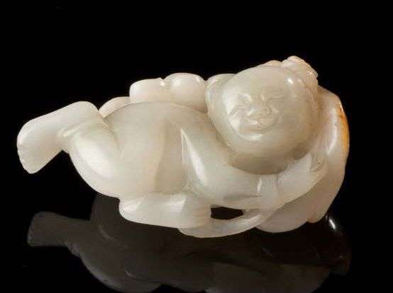 Figurine en jade clair avec trace de rouille sculpté représentant un enfant tenant une feuille de nénuphar. 19ème siècle Long.:4.5 cm