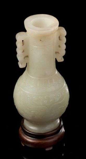 Petit vase balustre en jade clair sculpté sur la panse de masques de taotie, les anses ajourées en forme de chimères. 20ème siècle Haut.: 11 cm